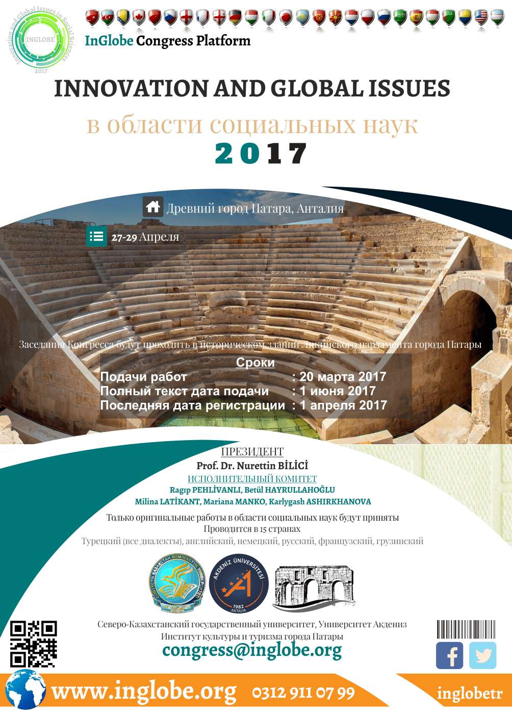 Мы сердечно приглашаем Вас принять участие в конгрессе "Innovation and Global Issues в области социальных наук 2017" Конгресс (InGlobe). Oрганизованный свободной академической платформой совместно с НПО и другими университетами. Конференция будет проходить с 27 по 29 Апреля в древнем городе Патара, Анталья. Целью нашей конференции является поддержка, поощрение и обеспечение платформы для создания сетей, обмена, и обогащения потенциалa роста отдельных ученых по всему земному шару с инновационным подходом.