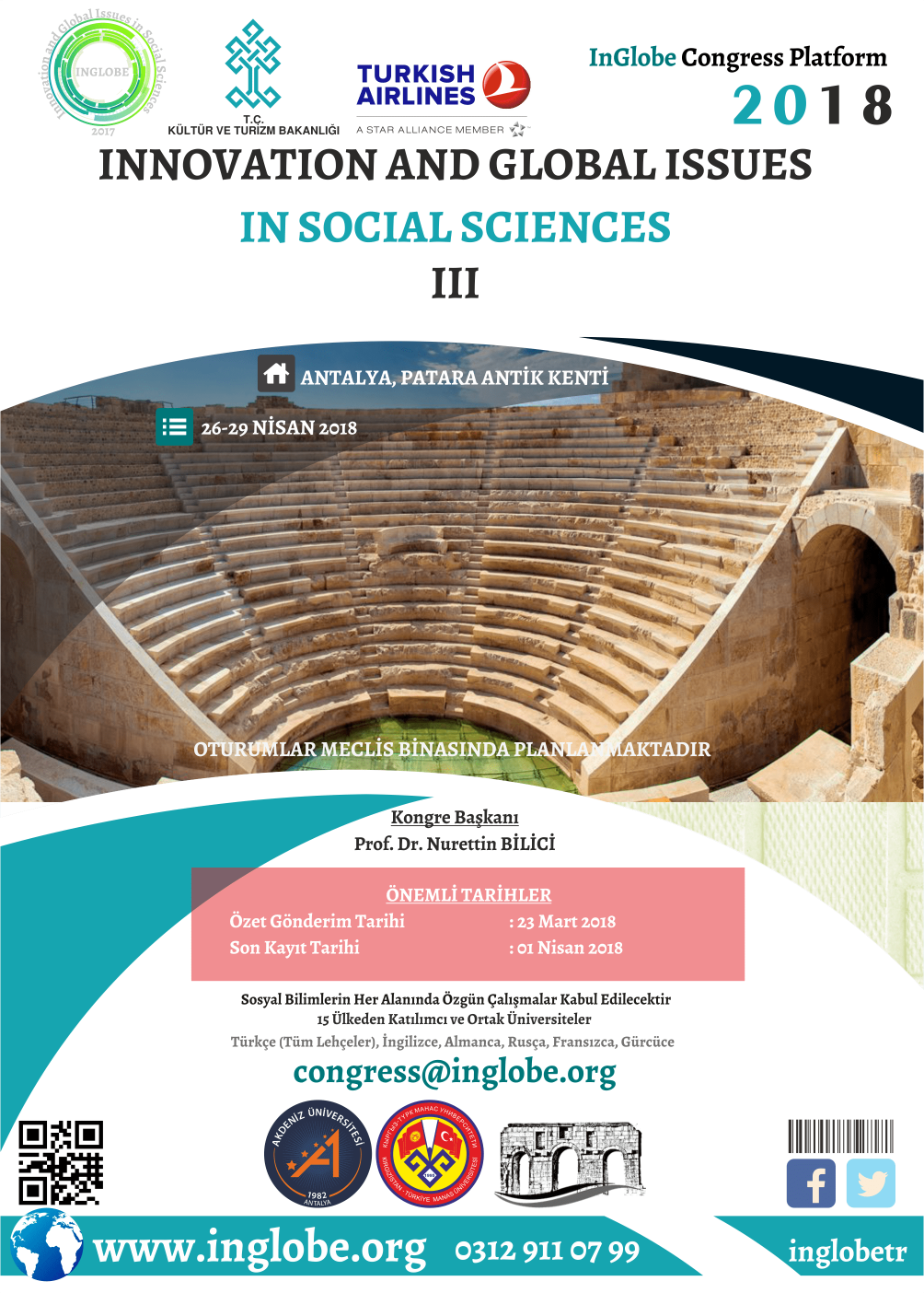 Birincisini Antalya ili, Kaş ilçesi, Patara Antik Kenti Meclis Binasında, ikincisini Antalya Lara'da gerçekleştirmiş olduğumuz kongremizin üçüncüsü gelen talepler üzerine 26-29 Nisan 2018 tarihlerinde tekrar Patara Antik Kentinde gerçekleştirilecektir. Kamu kurumları, dünya'nın farklı ülkelerinden üniversitler ve STK'lar tarafından oluşturulan platform tarafından düzenlecek olan "Innovation and Global Issues in Social Sciences III" isimli kongrede sizleri de görmek isteriz.