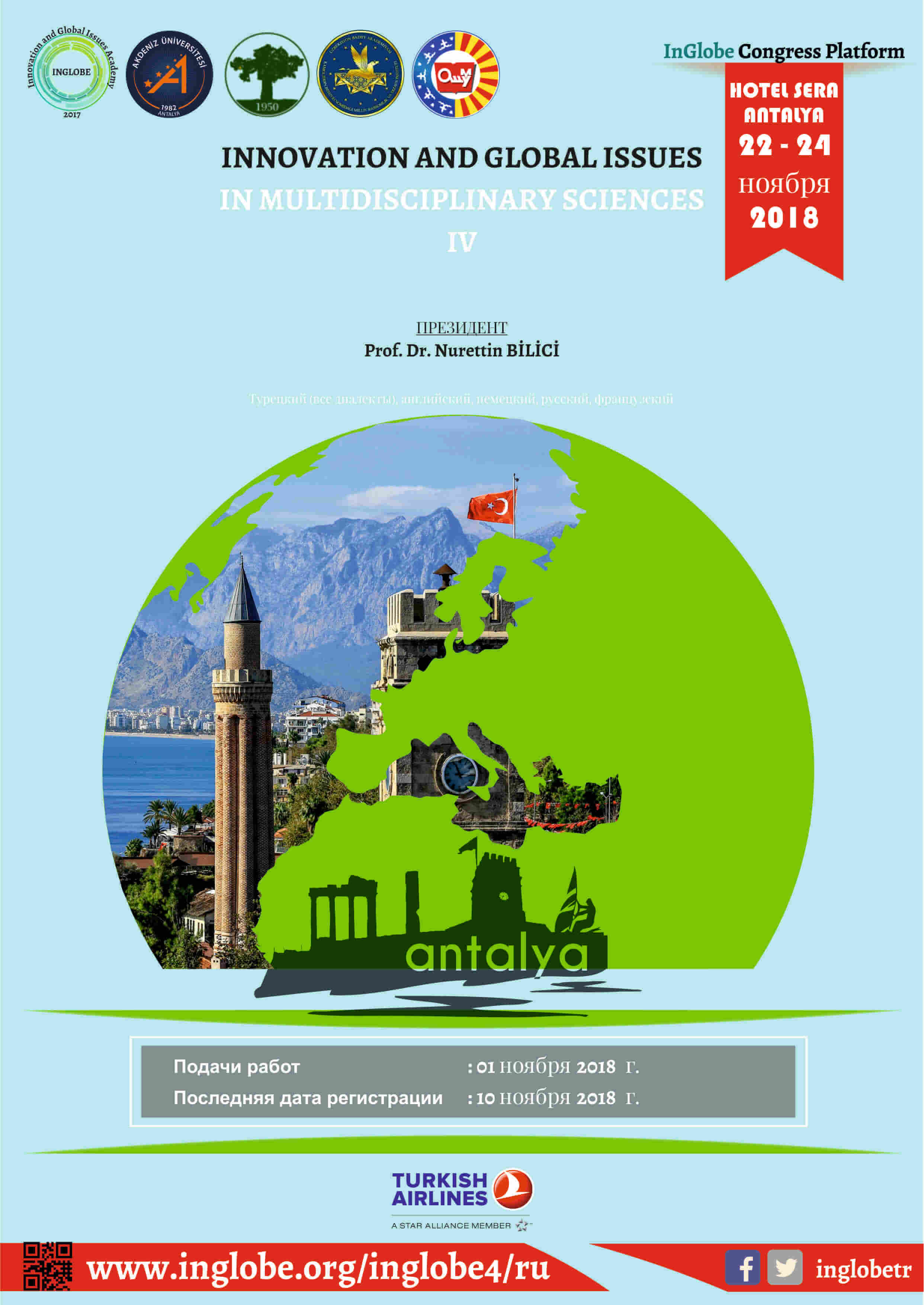 Мы сердечно приглашаем Вас принять участие в конгрессе "Инновация и глобальные проблемы многопрофильных наук IV" Конгресс (InGlobe). Oрганизованный свободной академической платформой совместно с НПО и другими университетами. Конференция будет проходить с 22 по 24 ноября в древнем городе Сера отель, Анталья. Целью нашей конференции является поддержка, поощрение и обеспечение платформы для создания сетей, обмена, и обогащения потенциалa роста отдельных ученых по всему земному шару с инновационным подходом.